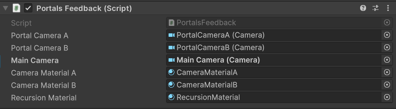 | Camera Material A | The material to which portal camera A is rendered. |