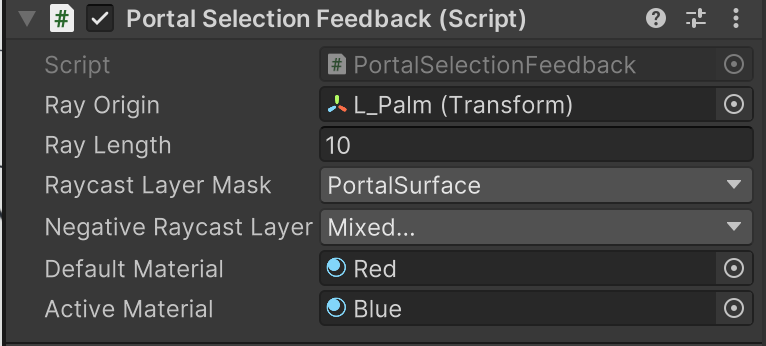 This PortalSelectionFeedback is responsible for providing visual feedback for the portal placement process. It creates a raycast from a given origin and changes the line renderer's appearance based on whether a suitable surface for portal placement has been hit.