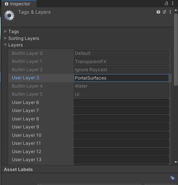 Important: Before using the sample scene, User Layer 3 must be set to PortalSurfaces and the layer mask on the Portal Selection Feedback component must be configured as follows:
