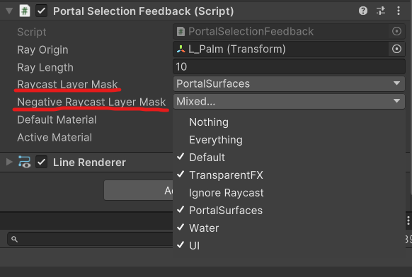 | Negative Raycast Layer Mask | Layer mask to filter the raycast for invalid portal surfaces. |