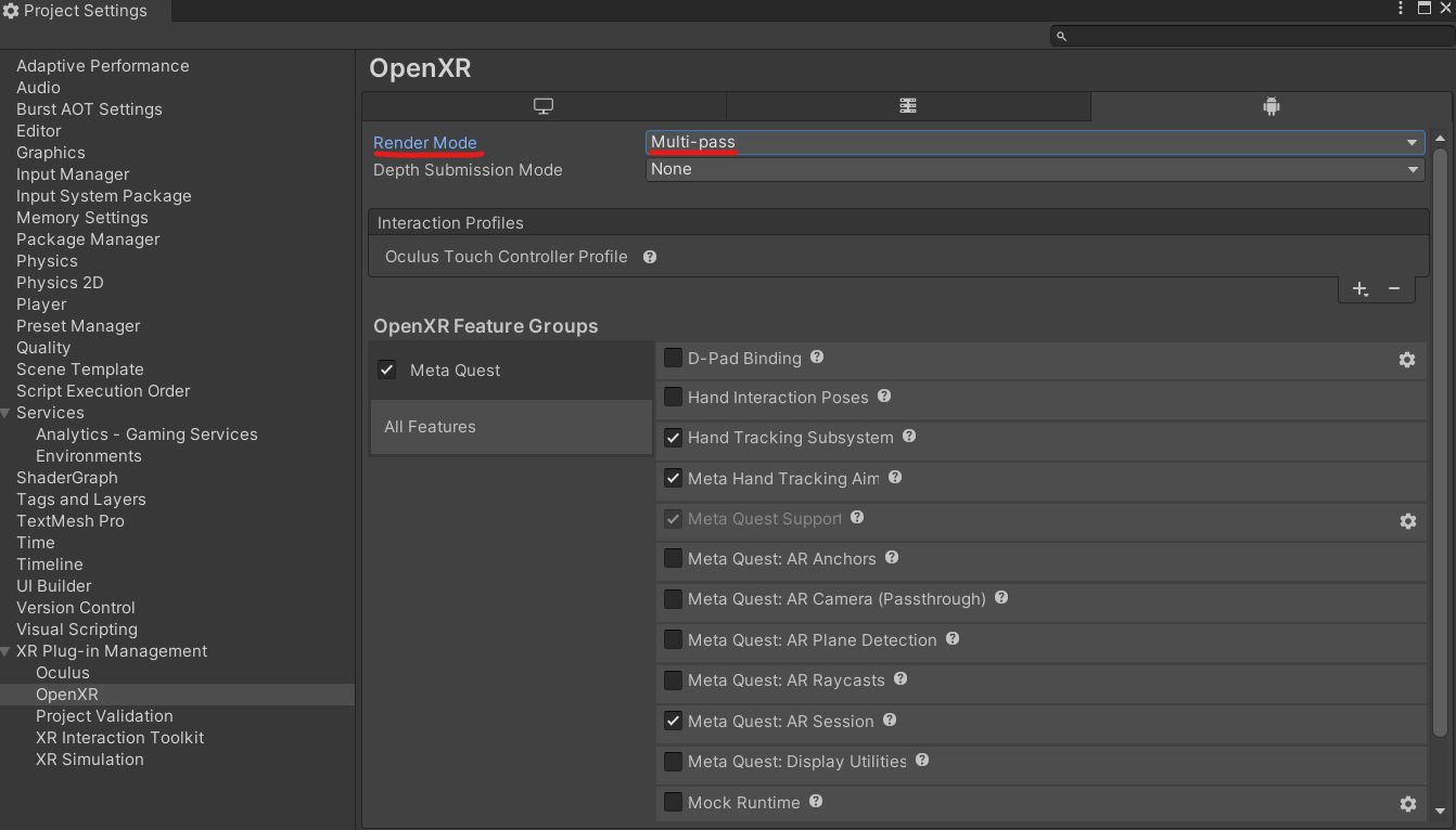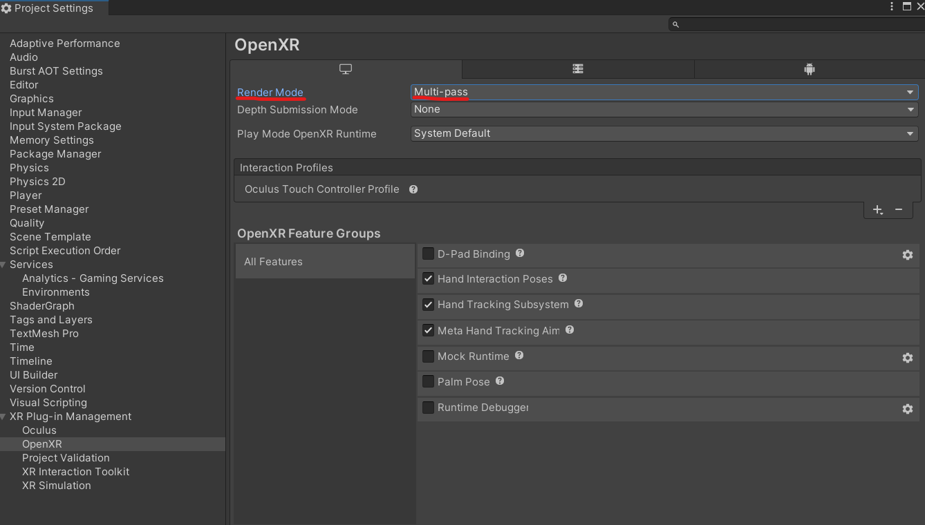 Additionally, in order for the portal shader to render correctly, the Unity project settings must have OpenXR configured with Render Mode set to Multi-pass in the following places: