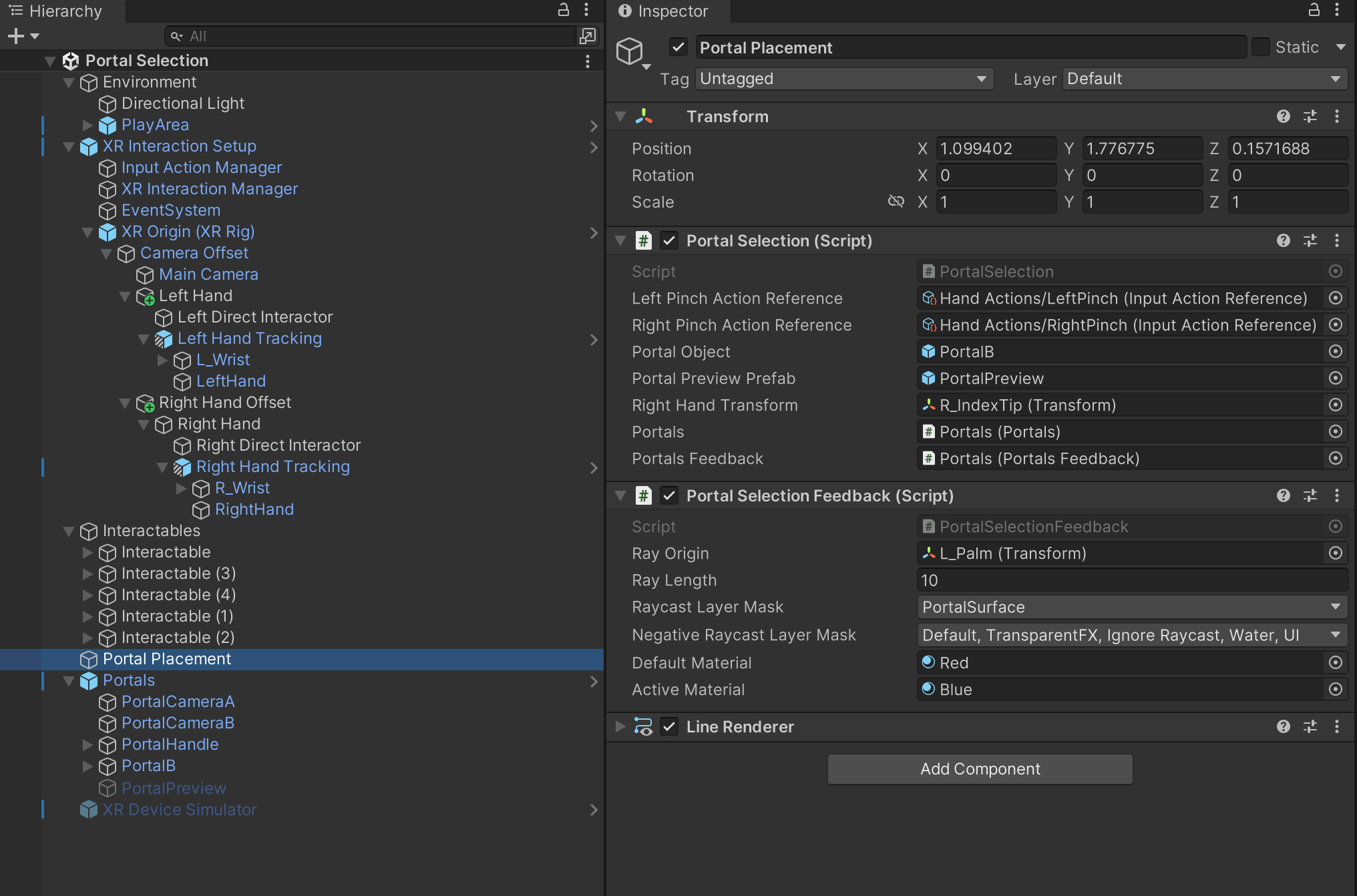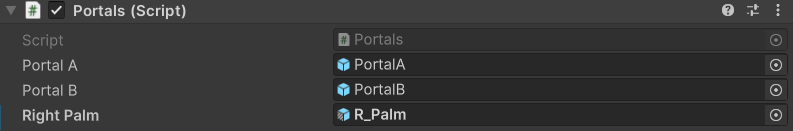 | Portal A | The first of the two portal GameObjects, appearing with an orange outline and anchored near the user. |