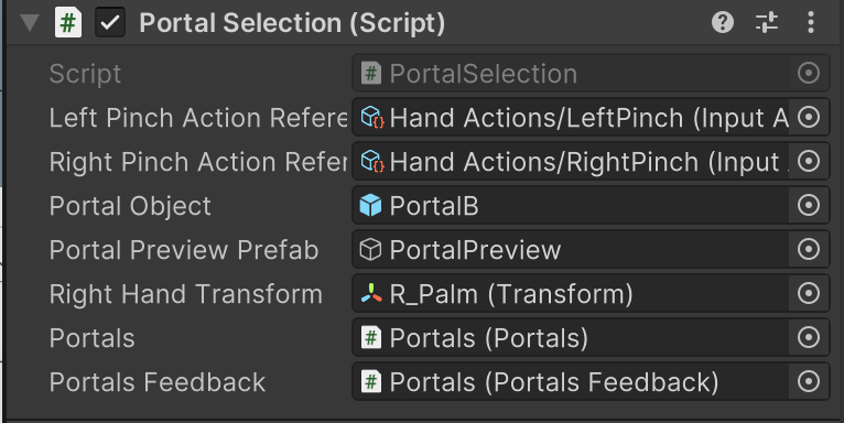 This component is responsible for providing feedback for the portals of the Portal Selection interaction technique. This includes rendering the surface of each portal by positioning a camera behind the view of the opposite portal.