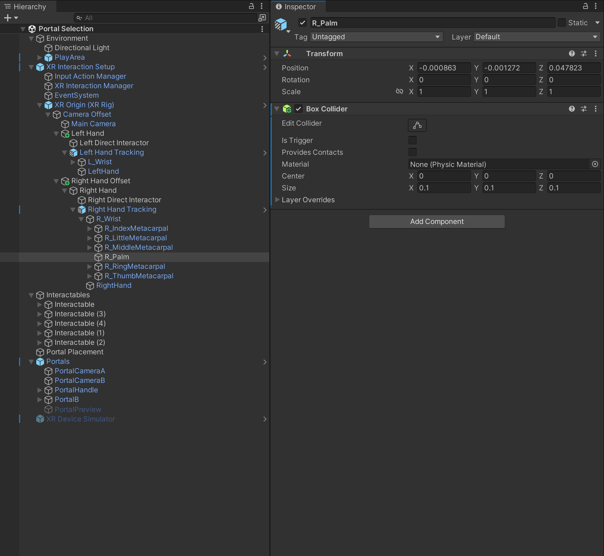 This third screenshot shows that a collider must be placed on the right palm hand tracker.